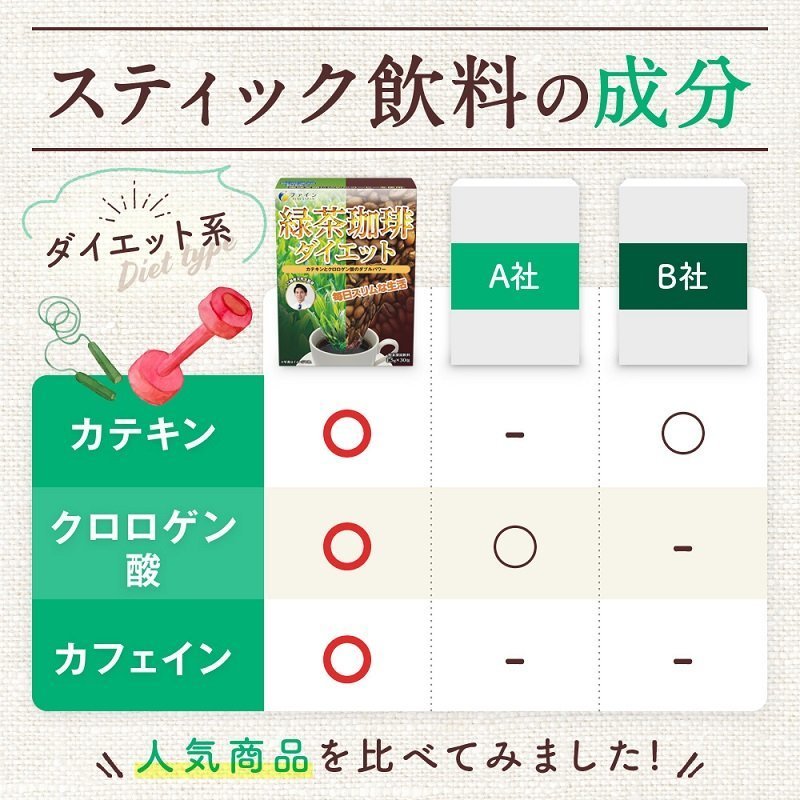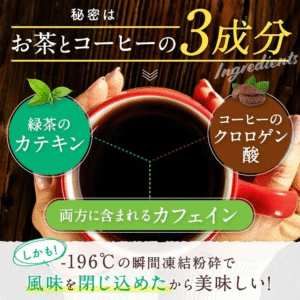 每杯只有低卡路里含量 > 5.3kcal,輕鬆收復減肥瘦身。綠茶的茶素中,綠原酸成份有助脂肪燃燒。增加熱能消耗,管理體重預防肥胖。能夠在減少身體脂肪,幫助纖體美態效果。咖啡香味醇厚,締造飽滿順滑口感,瘦身同時又可提神。入口滑順、甘甜不澀、不酸、苦味驟降。咖啡豆有濃厚的綠茶香味。獨立包裝容易攜帶。日本瘦身專家工藤孝文是專研醫生親身試法,測試前他的體重為92KG測試期間並沒有強逼自己做運動,刻意控制飲食。在幾乎跟日常生活沒差情況下只依靠在餐前,