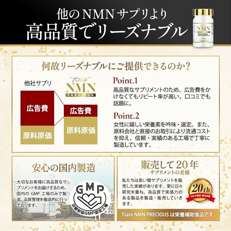一樽含20250mg高純度100% β NMN。每日只需,就有驚人的 675 毫克NMN。NMN 通常是在體內“自然”產生的。但是,與20多歲時相比,50多歲時大約有一半,並且會隨著年齡的增長而減少。NMN 現時為全世界的熱門話題用作保持年輕和健康身體。這產品除了NMN外,還含有精心挑選的美容成分組合!如豬胎盤素、輔酶、白藜蘆醇、葡萄籽提取物、硫辛酸外,還添加了蛋白聚醣、蝦青素、玉米神經酰胺等精挑細選的成分,達到了黃金比例。